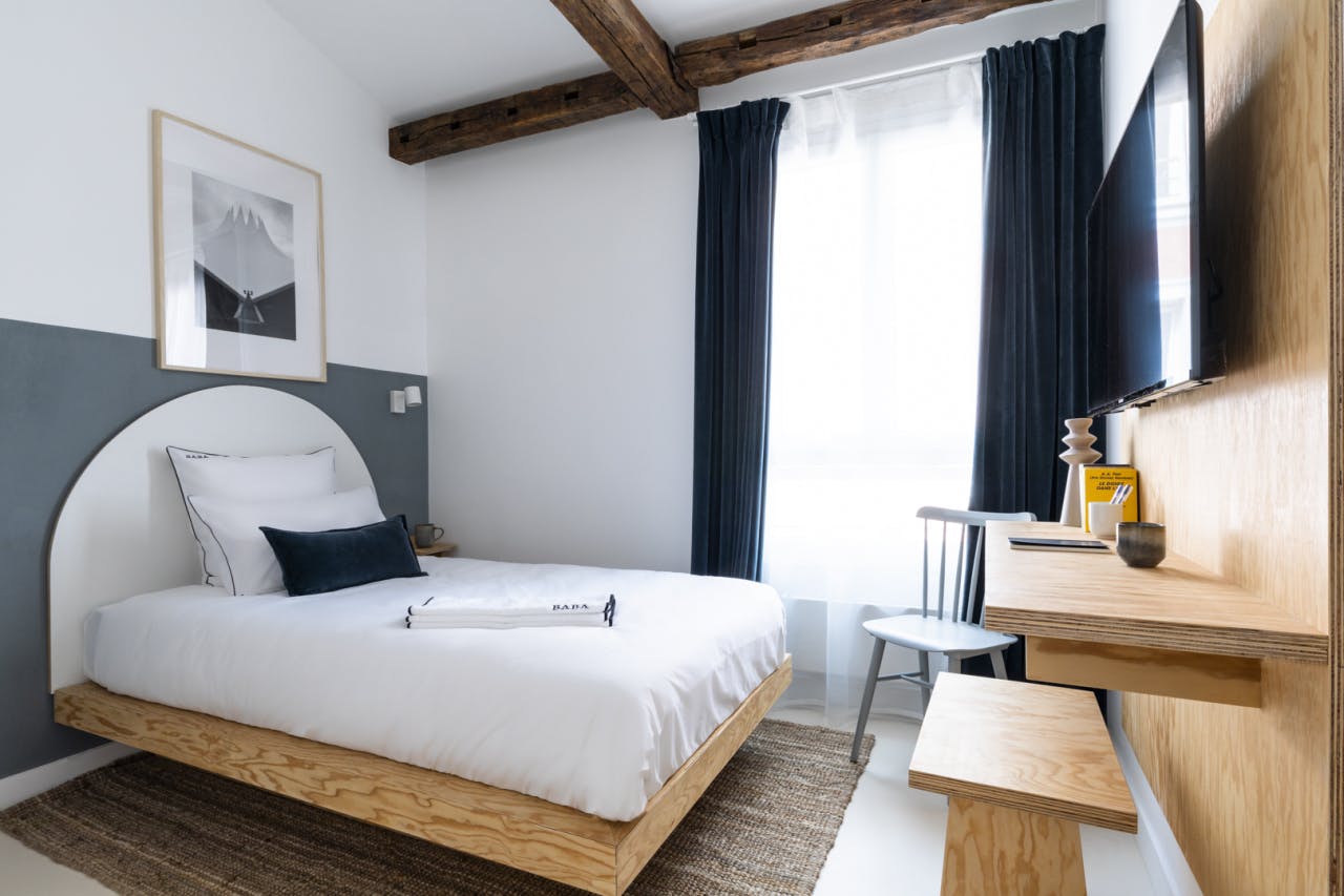 La chambre Single Classique est la chambre idéale pour un court séjour professionnel ou touristique à la capitale. Ces chambres cosy avec une superficie de 9 m², sont dotées d'un grand lit (110x200 cm), d'un bureau, d'un coin de rangement avec cintres et étagères, d'une table de chevet, de lampes de chevet et liseuses, d'une TV écran plat avec chaînes internationales et sportives, du WiFi. Nous vous rappelons que les chambres singles peuvent accueillir une seule personne maximum et qu'il est interdit de loger deux personnes dans une chambre single. Nous ne disposons pas de chambres de cette catégorie accessibles aux personnes à mobilité réduite.